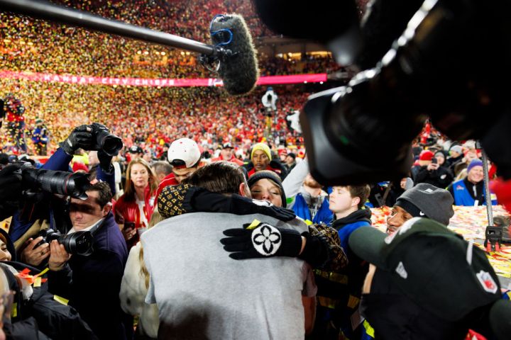 KANSAS CITY, MISSOURI – JANUARY 26: Taylor Swift embraces tight end Travis Kelce #87 of the Kansas City Chiefs following the AFC Championship NFL football game against the Buffalo Bills at GEHA Field at Arrowhead Stadium on January 26, 2025 in Kansas City, Missouri. (Photo by Todd Rosenberg/Getty Images) color image,photography,celebrities,arts culture and entertainment,horizontal,usa,sport,playoffs,american football – sport,nfl,stadium,match – sport,embracing,taylor swift,buffalo bills,tight end,nfl playoffs,missouri,kansas city chiefs,afc championship game,arrowhead stadium,travis kelce