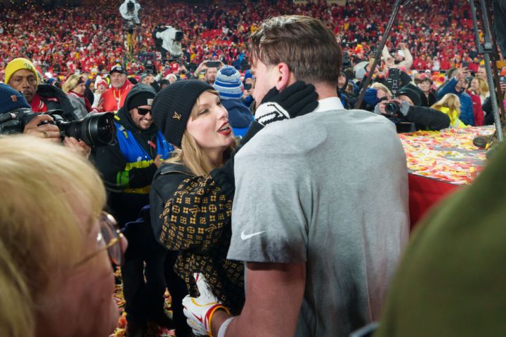 KANSAS CITY, MISSOURI – JANUARY 26: Taylor Swift embraces tight end Travis Kelce #87 of the Kansas City Chiefs following the AFC Championship NFL football game against the Buffalo Bills at GEHA Field at Arrowhead Stadium on January 26, 2025 in Kansas City, Missouri. (Photo by Todd Rosenberg/Getty Images) color image,photography,celebrities,arts culture and entertainment,horizontal,usa,topix,sport,playoffs,american football – sport,nfl,stadium,match – sport,embracing,taylor swift,buffalo bills,tight end,nfl playoffs,missouri,kansas city chiefs,afc championship game,arrowhead stadium,travis kelce
