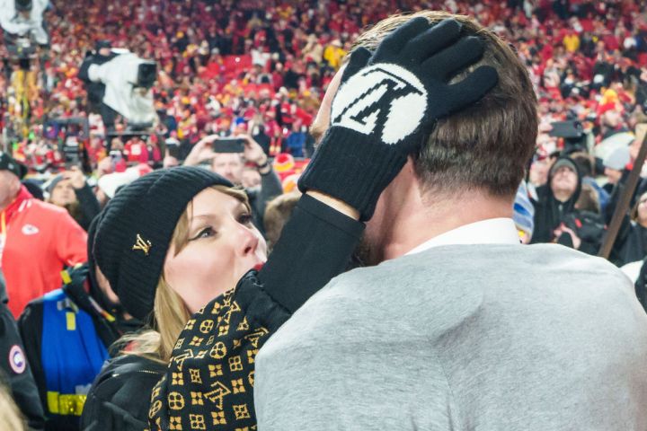KANSAS CITY, MISSOURI – JANUARY 26: Taylor Swift kisses Travis Kelce #87 of the Kansas City Chiefs after defeating the Buffalo Bills 32-29 in the AFC Championship Game at GEHA Field at Arrowhead Stadium on January 26, 2025 in Kansas City, Missouri. (Photo by Jamie Squire/Getty Images) color image,photography,celebrities,arts culture and entertainment,horizontal,usa,sport,playoffs,american football – sport,nfl,stadium,match – sport,taylor swift,buffalo bills,nfl playoffs,missouri,kansas city chiefs,afc championship game,arrowhead stadium,travis kelce