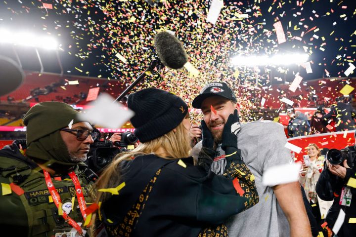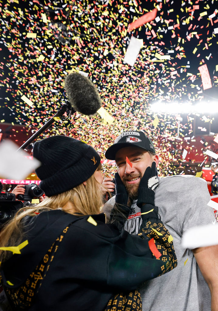 KANSAS CITY, MISSOURI – JANUARY 26: Tight end Travis Kelce #87 of the Kansas City Chiefs celebrates with Taylor Swift after the AFC Championship football game against the Buffalo Bills, at GEHA Field at Arrowhead Stadium on January 26, 2025 in Kansas City, Missouri. (Photo by Brooke Sutton/Getty Images) color image,photography,celebrities,arts culture and entertainment,horizontal,usa,topix,sport,playoffs,american football – sport,nfl,stadium,match – sport,taylor swift,buffalo bills,tight end,nfl playoffs,missouri,bestpix,kansas city chiefs,afc championship game,arrowhead stadium,travis kelce